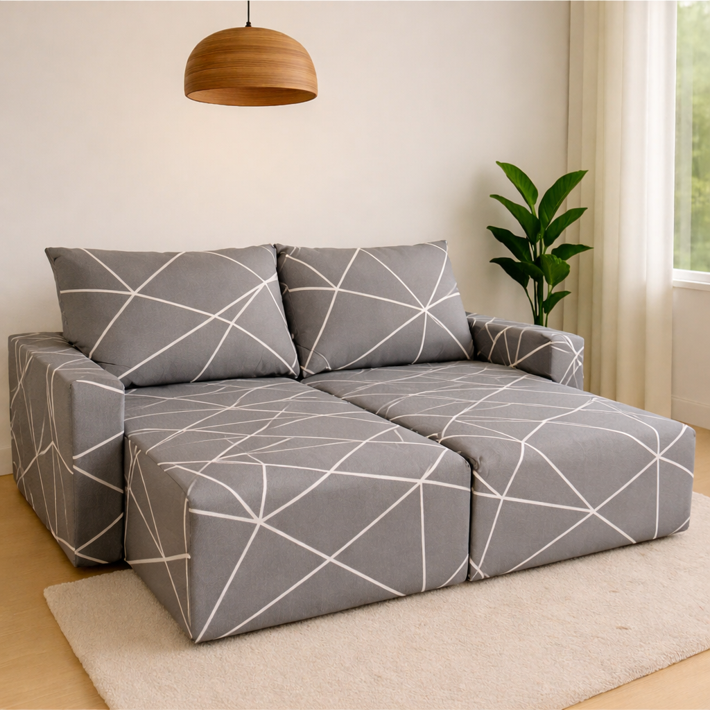 Tecido flexível e resistente: adapta-se ao formato do sofá, proporcionando um caimento elegante e firme.