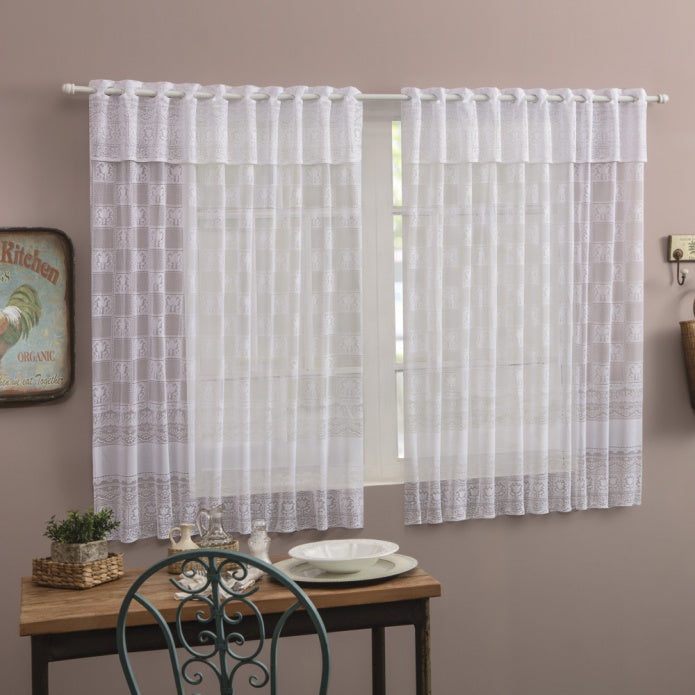 Linda cortina para cozinha ou sala, confeccionada em renda. O toque suave e a delicada transparência deixará o ambiente extremamente aconchegante e alegre